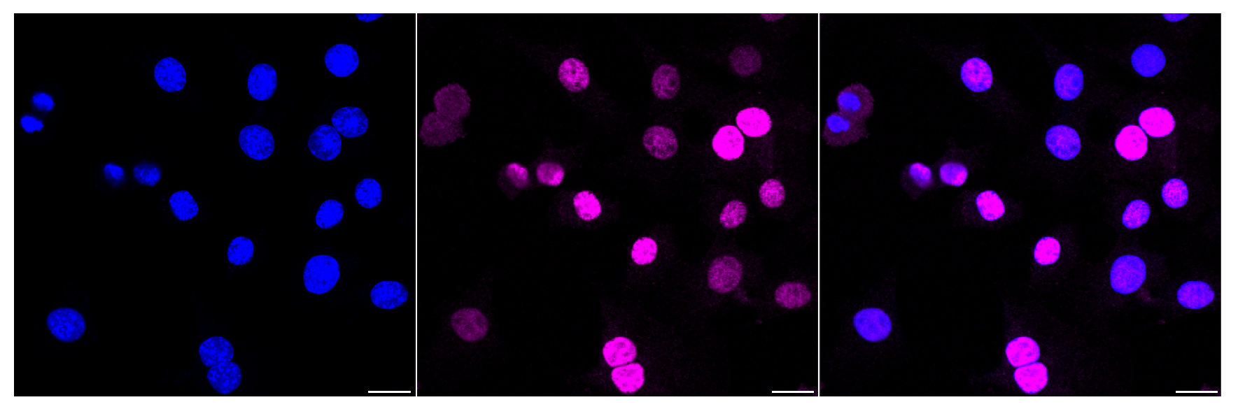 • Immunocytochemical staining of C2C12 cells with Cyclin D1 antibody. Nuclei were stained blue with DAPI; Cyclin D1 was stained magenta with Alexa Fluor? 647. Images were taken using Leica stellaris 5. Protein abundance based on laser Intensity and smart gain: High. Scale bar, 20 μm.