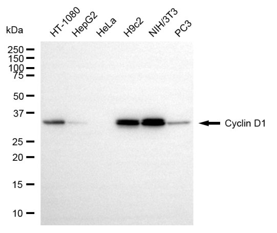 • Western blotting analysis using cyclin D1 antibody. Total cell lysates (30 μg) from various cell lines were loaded and separated by SDS-PAGE. The blot was incubated with cyclin D1 antibody and HRP-conjugated goat anti-rabbit secondary antibody respectively.
