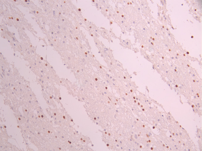 IHC image of CSB-RA172341A0HU diluted at 1:100 and staining in paraffin-embedded human glioma cancer performed on a Leica BondTM system. After dewaxing and hydration, antigen retrieval was mediated by high pressure in a citrate buffer (pH 6.0). Section was blocked with 10% normal goat serum 30min at RT. Then primary antibody (1% BSA) was incubated at 4°C overnight. The primary is detected by a Goat anti-rabbit polymer IgG labeled by HRP and visualized using 0.05% DAB.