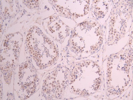 IHC image of CSB-RA172341A0HU diluted at 1:100 and staining in paraffin-embedded human testis tissue performed on a Leica BondTM system. After dewaxing and hydration, antigen retrieval was mediated by high pressure in a citrate buffer (pH 6.0). Section was blocked with 10% normal goat serum 30min at RT. Then primary antibody (1% BSA) was incubated at 4°C overnight. The primary is detected by a Goat anti-rabbit polymer IgG labeled by HRP and visualized using 0.05% DAB.