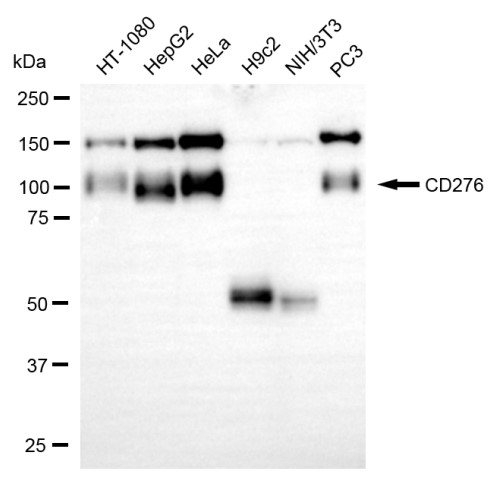 Western blotting analysis using CD276 antibody. Total cell lysates (30 μg) from various cell lines were loaded and separated by SDS-PAGE. The blot was incubated with CD276 antibody and HRP-conjugated goat anti-rabbit secondary antibody respectively.