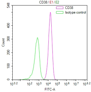 • Overlay Peak curve showing Raji cells surface stained with CSB-RA004929MA3HU (red line) at 1:100. Then 10% normal goat serum to block non-specific protein-protein interactions followed by the antibody (1ug/1*106cells) for 45min at 4℃. The secondary antibody used was FITC-conjugated Goat Anti-Mouse IgG(H+L) at 1:200 dilution for 35min at 4℃.Control antibody (green line) was mouse IgG2a (1ug/1*106cells) used under the same conditions. Acquisition of >10,000 events was performed.