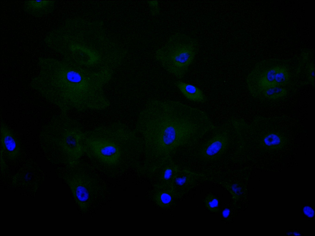 • Immunofluorescence staining of A549 cell with CSB-RA004929MA3HU at 1:30 ,counter-stained with DAPI. The cells were fixed in 4% formaldehyde and blocked in 10% normal Goat Serum. The cells were then incubated with the antibody overnight at 4°C. The secondary antibody was Alexa Fluor 488-congugated AffiniPure Goat Anti-Human IgG(H+L).