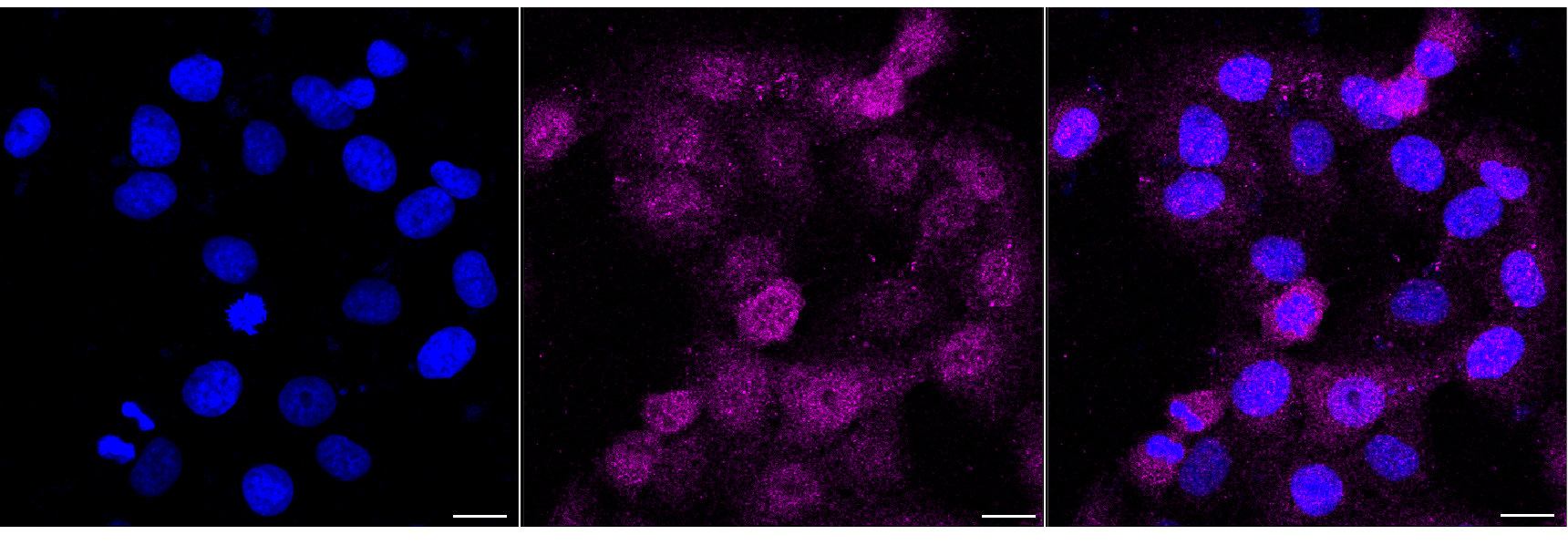Immunocytochemical staining of HT-1080 cells with CD82 antibody. Nuclei were stained blue with DAPI; CD82 was stained magenta with Alexa Fluor? 647. Images were taken using Leica stellaris 5. Protein abundance based on laser Intensity and smart gain: Medium. Scale bar, 20 μm.