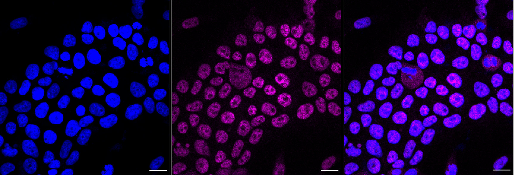 Immunocytochemical staining of Hela cells with CDC16 antibody. Nuclei were stained blue with DAPI; CDC16 was stained magenta with Alexa Fluor? 647. Images were taken using Leica stellaris 5. Protein abundance based on laser Intensity and smart gain: Medium. Scale bar, 20 μm.