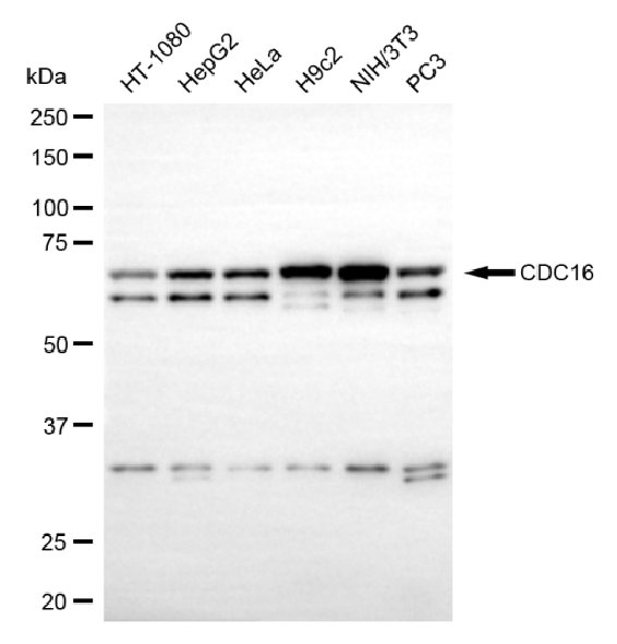 Western blotting analysis using CDC16 antibody. Total cell lysates (30 μg) from various cell lines were loaded and separated by SDS-PAGE. The blot was incubated with CDC16 antibody and HRP-conjugated goat anti-rabbit secondary antibody respectively.