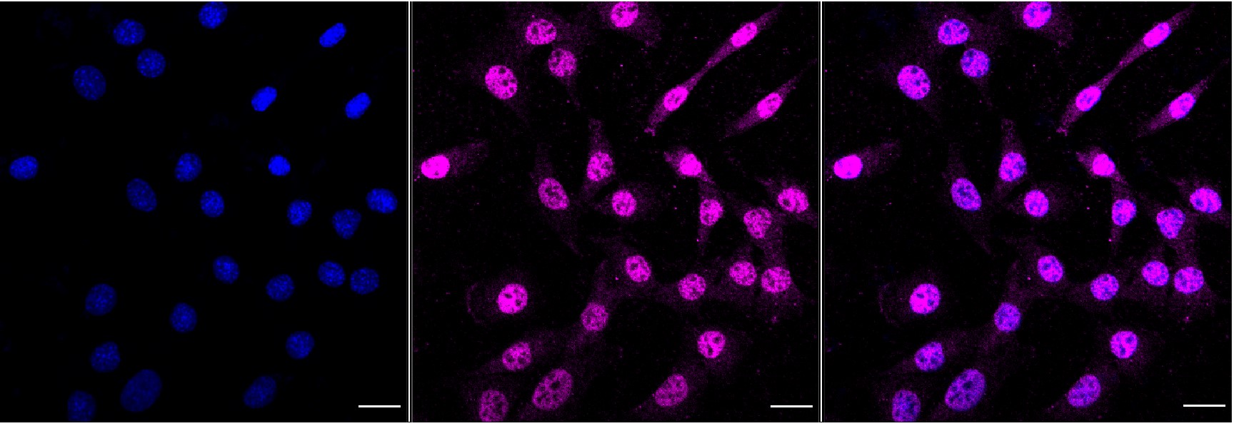 Immunocytochemical staining of C2C12 cells with CDC23?antibody. Nuclei were stained blue with DAPI; CDC23 was stained magenta with Alexa Fluor? 647. Images were taken using Leica stellaris 5. Protein abundance based on laser Intensity and smart gain: Medium. Scale bar, 20 μm.
