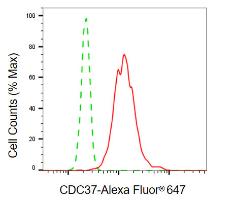Flow cytometric analysis of CDC37 expression in HT-1080 cells using CDC37 antibody. Green, isotype control; red, CDC37.