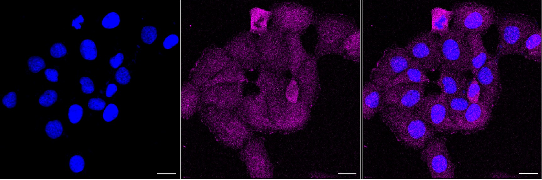 Immunocytochemical staining of HT-1080 cells with CDC37 antibody. Nuclei were stained blue with DAPI; CDC37 was stained magenta with Alexa Fluor? 647. Images were taken using Leica stellaris 5. Protein abundance based on laser Intensity and smart gain: Medium. Scale bar, 20 μm.
