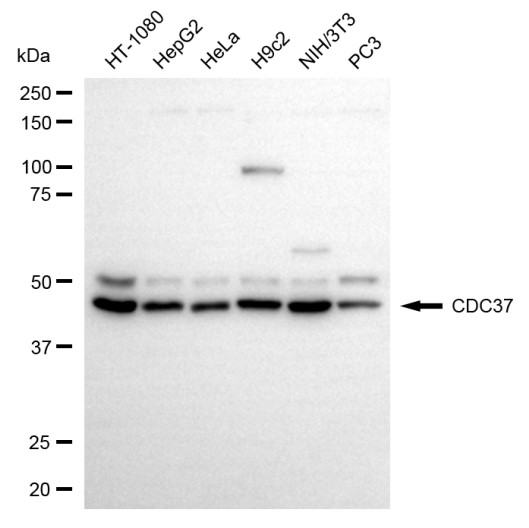 Western blotting analysis using CDC37 antibody. Total cell lysates (30 μg) from various cell lines were loaded and separated by SDS-PAGE. The blot was incubated with CDC37 antibody and HRP-conjugated goat anti-rabbit secondary antibody respectively.