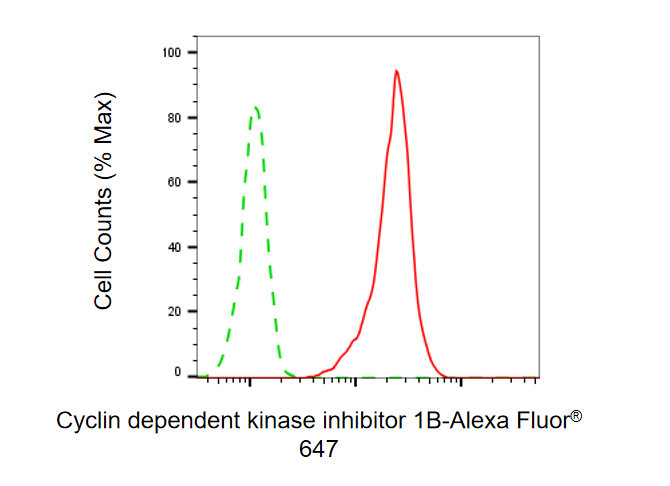 Flow cytometric analysis of Cyclin dependent kinase inhibitor 1B expression in HAP-1 cells using Cyclin dependent kinase inhibitor 1B antibody. Green, isotype control; red, Cyclin dependent kinase inhibitor 1B.