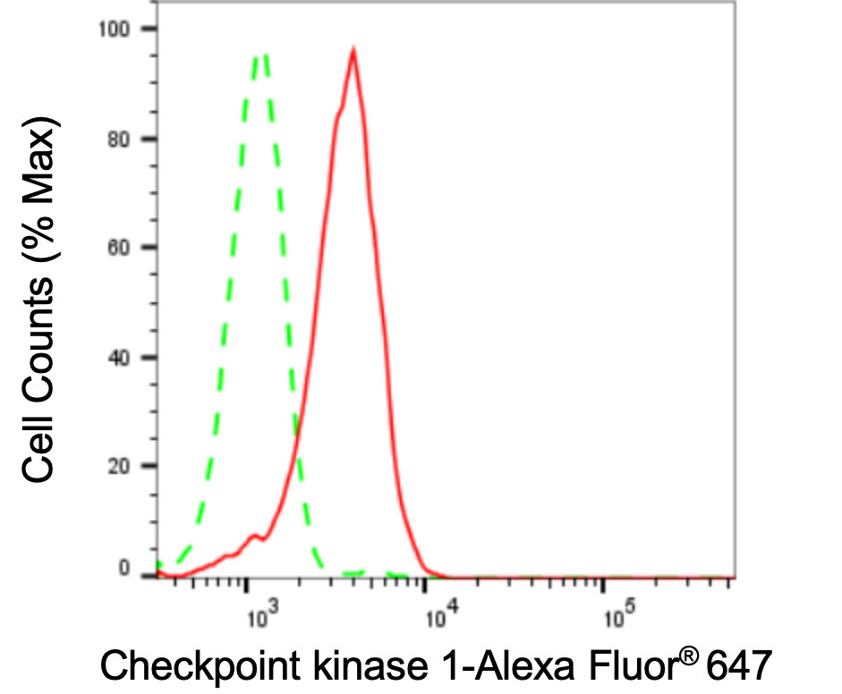 Flow cytometric analysis of Checkpoint kinase 1 expression in HepG2 cells using Checkpoint kinase 1 antibody. Green, isotype control; red, Checkpoint kinase 1.