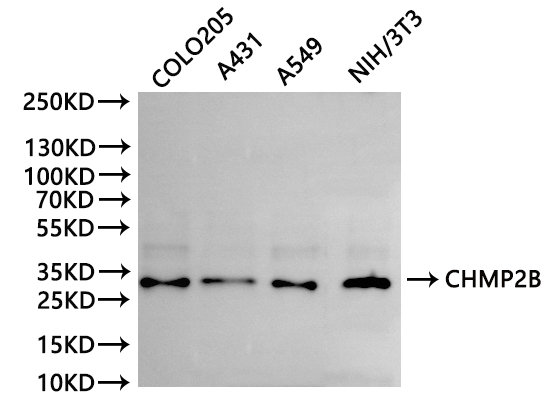 , Positive WB detected in:COLO205 whole cell lysate(30μg), A431 whole cell lysate(30μg), A549 whole cell lysate(30μg), NIH/3T3 whole cell lysate(30μg)