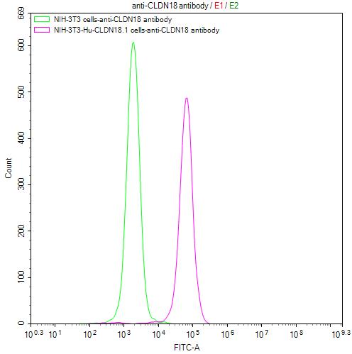 Untransfected NIH-3T3 cells (green line) and transfected Human CLDN18.1 NIH-3T3 stable cells (red line) were stained with anti-CLDN18 antibody (2μg/1*106cells), washed and then followed by FITC-conjugated anti-Human IgG Fc antibody and analyzed with flow cytometry.