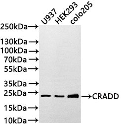 CASP2 and RIPK1 domain containing adaptor with death domain antibody; Caspase and RIP adapter with death domain antibody; Caspase and RIP adaptor with death domain antibody; Cradd antibody; CRADD_HUMAN antibody; Death adaptor molecule RAIDD antibody; Death domain containing protein CRADD antibody; Death domain-containing protein CRADD antibody; MGC9163 antibody; RIP associated ICH1/CED3 homologous protein with death domain antibody; RIP associated protein with a death domain antibody; RIP-associated protein with a death domain antibody
