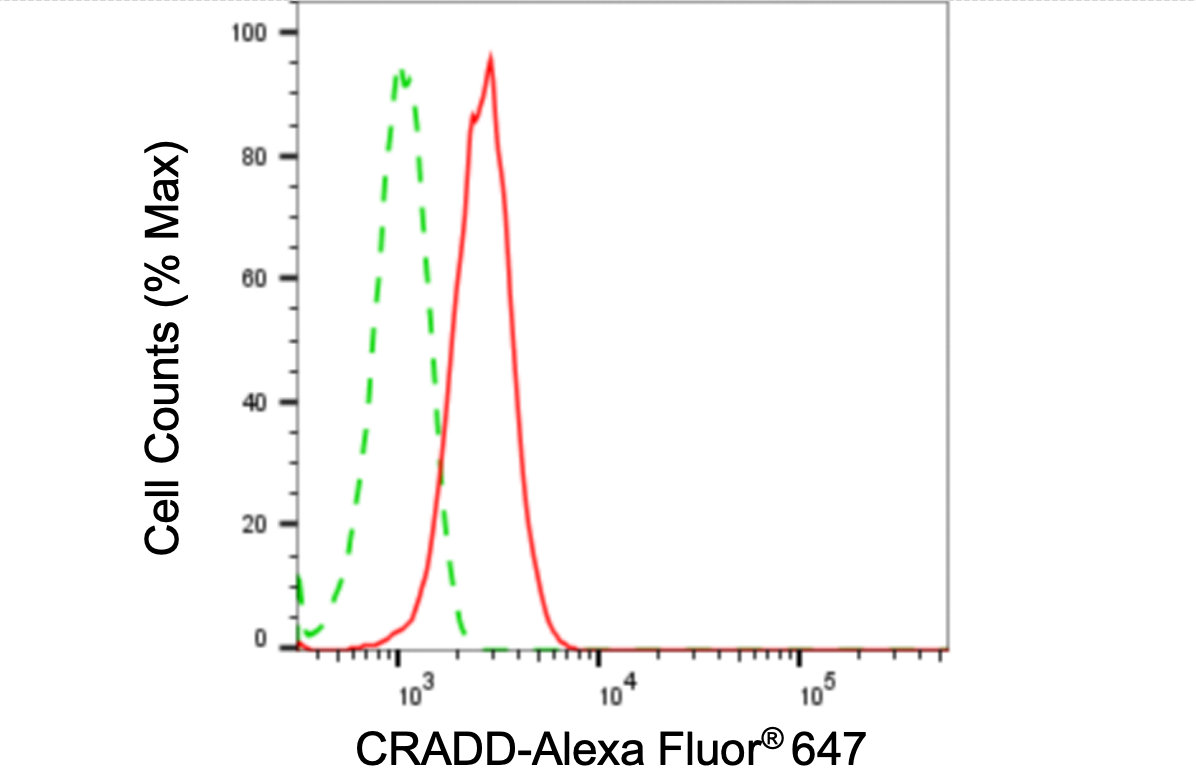 • Flow cytometric analysis of CRADD expression in HepG2 cells using CRADD antibody. Green, isotype control; red, CRADD.