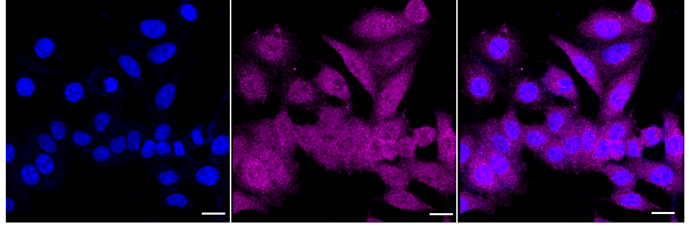 • Immunocytochemical staining of HepG2 cells with CRADD antibody. Nuclei were stained blue with DAPI; CRADD was stained magenta with Alexa Fluor? 647. Images were taken using Leica stellaris 5. Protein abundance based on laser Intensity and smart gain: Medium. Scale bar: 20 μm.