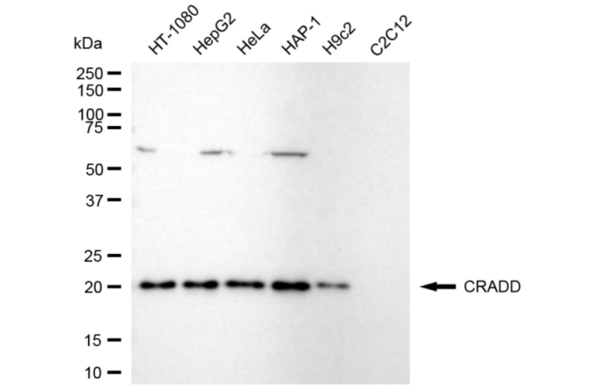 • Western blotting analysis using CRADD antibody. Total cell lysates (30 μg) from various cell lines were loaded and separated by SDS-PAGE. The blot was incubated with CRADD antibody and HRP-conjugated goat anti-rabbit secondary antibody respectively.