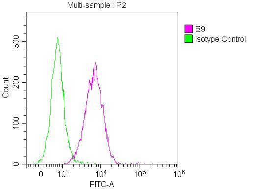 Overlay Peak curve showing Hela cells stained with CSB-RA002831A0HU (red line) with 1 μg/well (10 μg/mL, 100 μL/well). Then 10% normal goat serum was Incubated to block non-specific protein-protein interactions followed by the antibody (1μg/1*106cells) for 45 min at 4°C. The secondary antibody used was FITC-conjugated Goat Anti-Mouse IgG(H+L) at 1/200 dilution for 35 min at 4°C. Isotype control antibody (green line) was mouse IgG1 (1μg/1*106cells) used under the same conditions.Acquisition of >10,000 events was performed.