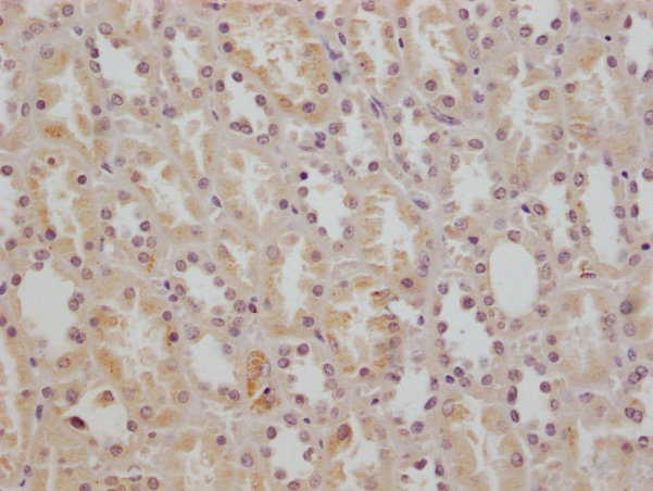 IHC image of CSB-RA002831A0HU diluted at 1:200 and staining in paraffin-embedded human kidney tissue performed on a Leica BondTM system. After dewaxing and hydration, antigen retrieval was mediated by high pressure in a citrate buffer (pH 6.0). Section was blocked with 10% normal goat serum 30min at RT. Then primary antibody (1% BSA) was incubated at 4°C overnight. The primary is detected by a Goat anti-mouse polymer IgG labeled by HRP and visualized using 0.05% DAB.