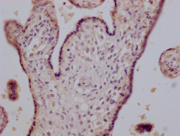 IHC image of CSB-RA002831A0HU diluted at 1:200 and staining in paraffin-embedded human placenta tissue performed on a Leica BondTM system. After dewaxing and hydration, antigen retrieval was mediated by high pressure in a citrate buffer (pH 6.0). Section was blocked with 10% normal goat serum 30min at RT. Then primary antibody (1% BSA) was incubated at 4°C overnight. The primary is detected by a Goat anti-mouse polymer IgG labeled by HRP and visualized using 0.05% DAB.