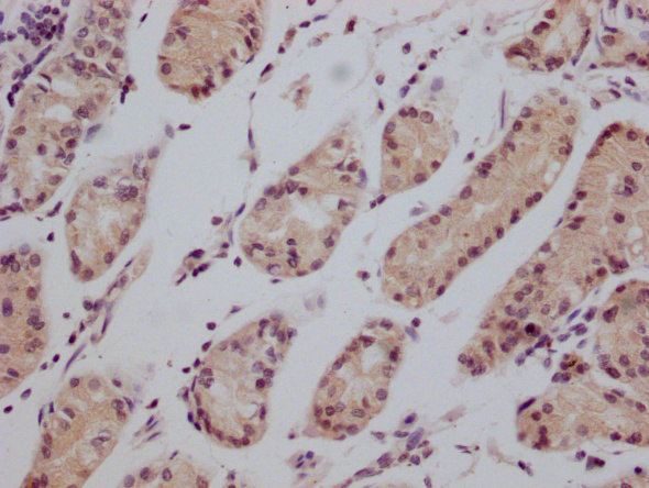 IHC image of CSB-RA002831A0HU diluted at 1:200 and staining in paraffin-embedded human stomach tissue performed on a Leica BondTM system. After dewaxing and hydration, antigen retrieval was mediated by high pressure in a citrate buffer (pH 6.0). Section was blocked with 10% normal goat serum 30min at RT. Then primary antibody (1% BSA) was incubated at 4°C overnight. The primary is detected by a Goat anti-mouse polymer IgG labeled by HRP and visualized using 0.05% DAB.