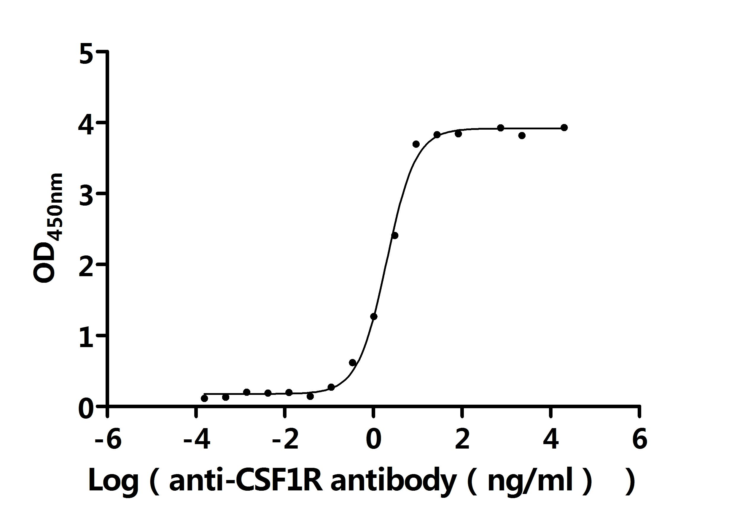 功能:Tyrosine-protein kinase that acts as cell-surface receptor for CSF1 and IL34 and plays an essential role in the regulation of survival, proliferation and differentiation of hematopoietic precursor cells, especially mononuclear phagocytes, such as macrophages and monocytes. Promotes the release of proinflammatory chemokines in response to IL34 and CSF1, and thereby plays an important role in innate immunity and in inflammatory processes. Plays an important role in the regulation of osteoclast proliferation and differentiation, the regulation of bone resorption, and is required for normal bone and tooth development. Required for normal male and female fertility, and for normal development of milk ducts and acinar structures in the mammary gland during pregnancy. Promotes reorganization of the actin cytoskeleton, regulates formation of membrane ruffles, cell adhesion and cell migration, and promotes cancer cell invasion. Activates several signaling pathways in response to ligand binding, including the ERK1/2 and the JNK pathway. Phosphorylates PIK3R1, PLCG2, GRB2, SLA2 and CBL. Activation of PLCG2 leads to the production of the cellular signaling molecules diacylglycerol and inositol 1,4,5-trisphosphate, that then lead to the activation of protein kinase C family members, especially PRKCD. Phosphorylation of PIK3R1, the regulatory subunit of phosphatidylinositol 3-kinase, leads to activation of the AKT1 signaling pathway. Activated CSF1R also mediates activation of the MAP kinases MAPK1/ERK2 and/or MAPK3/ERK1, and of the SRC family kinases SRC, FYN and YES1. Activated CSF1R transmits signals both via proteins that directly interact with phosphorylated tyrosine residues in its intracellular domain, or via adapter proteins, such as GRB2. Promotes activation of STAT family members STAT3, STAT5A and/or STAT5B. Promotes tyrosine phosphorylation of SHC1 and INPP5D/SHIP-1. Receptor signaling is down-regulated by protein phosphatases, such as INPP5D/SHIP-1, that dephosphorylate the receptor and its downstream effectors, and by rapid internalization of the activated receptor. In the central nervous system, may play a role in the development of microglia macrophages.