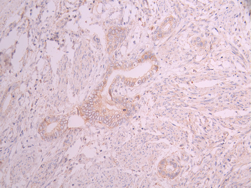 IHC image of CSB-RA268308A0HU diluted at 1:100 and staining in paraffin-embedded human cervical cancer performed on a Leica BondTM system. After dewaxing and hydration, antigen retrieval was mediated by high pressure in a citrate buffer (pH 6.0). Section was blocked with 10% normal goat serum 30min at RT. Then primary antibody (1% BSA) was incubated at 4°C overnight. The primary is detected by a Goat anti-rabbit polymer IgG labeled by HRP and visualized using 0.05% DAB.