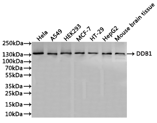 Positive WB detected in: Hela whole cell lysate(30μg), A549 whole cell lysate(30μg), HEK293 whole cell lysate(30μg), MCF-7 whole cell lysate(30μg), HT-29 whole cell lysate(30μg), HepG2 whole cell lysate(30μg), Mouse brain tissue lysate(30μg)