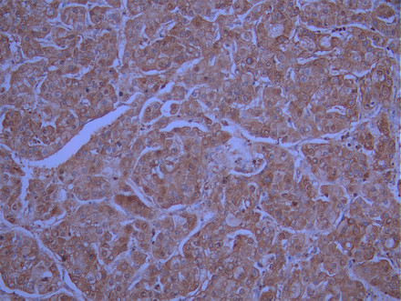 IHC image of CSB-RA080723A0HU diluted at 1:100 and staining in paraffin-embedded human liver cancer performed on a Leica BondTM system. After dewaxing and hydration, antigen retrieval was mediated by high pressure in a citrate buffer (pH 6.0). Section was blocked with 10% normal goat serum 30min at RT. Then primary antibody (1% BSA) was incubated at 4°C overnight. The primary is detected by a Goat anti-rabbit polymer IgG labeled by HRP and visualized using 0.05% DAB.
