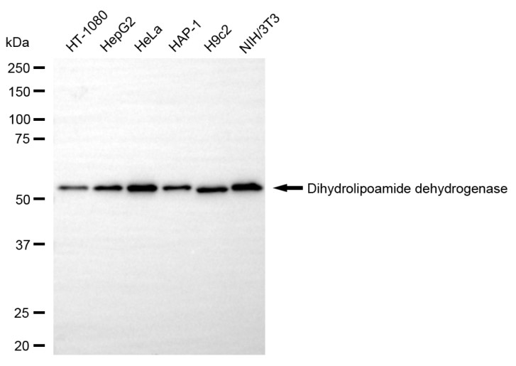 Western blotting analysis using dihydrolipoamide dehydrogenase antibody. Total cell lysates (30 μg) from various cell lines were loaded and separated by SDS-PAGE. The blot was incubated with dihydrolipoamide dehydrogenase antibody and HRP-conjugated goat anti-rabbit secondary antibody respectively.