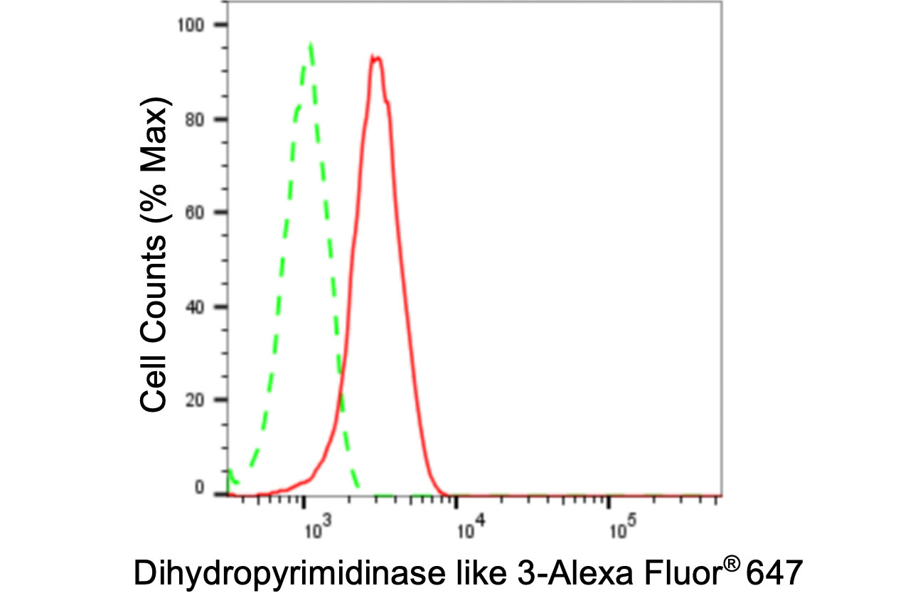 Flow cytometric analysis of Dihydropyrimidinase like 3 expression in HT-1080 cells using Dihydropyrimidinase like 3 antibody. Green, isotype control; red, Dihydropyrimidinase like 3.