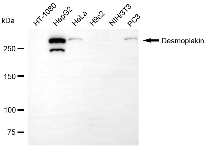 Western blotting analysis using desmoplakin antibody. Total cell lysates (30 μg) from various cell lines were loaded and separated by SDS-PAGE. The blot was incubated with desmoplakin antibody and HRP-conjugated goat anti-rabbit secondary antibody respectively.