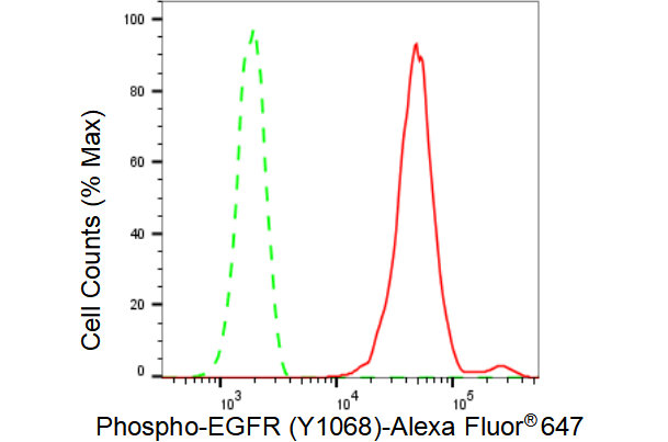 • Flow cytometric analysis of Phospho-EGFR (Y1068) expression in HepG2 cells using Phospho-EGFR (Y1068) antibody. Green, isotype control; red, Phospho-EGFR (Y1068).