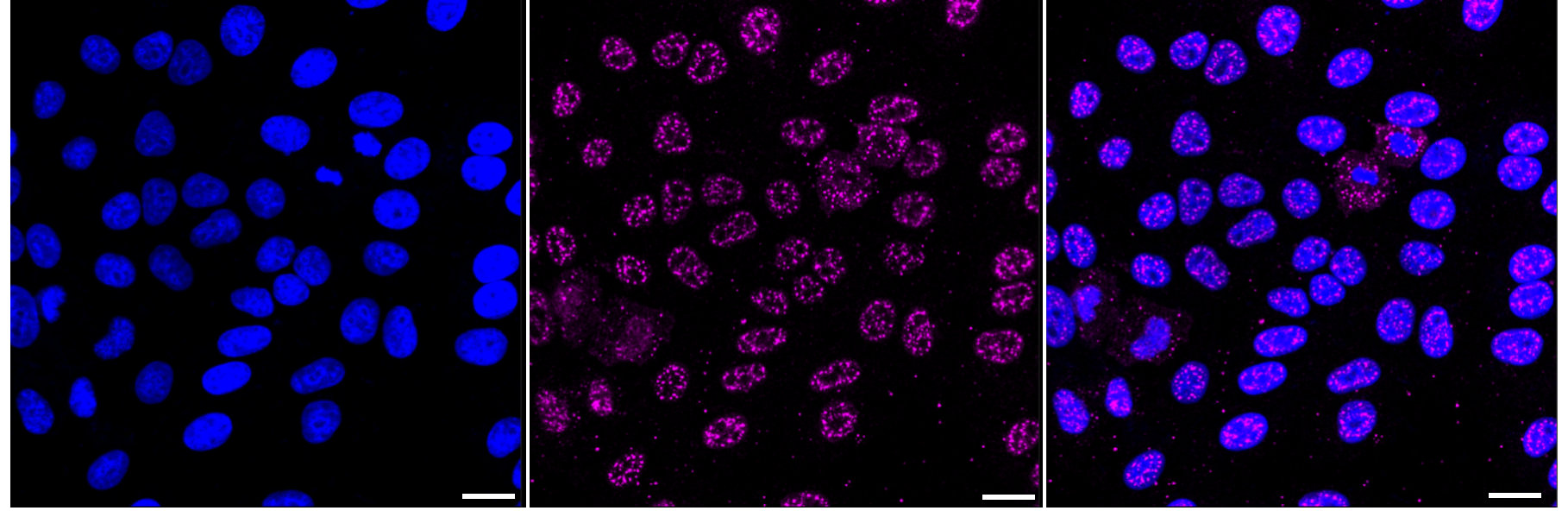 • Immunocytochemical staining of HepG2 cells with Phospho-EGFR (Y1068) antibody. Nuclei were stained blue with DAPI; Phospho-EGFR (Y1068) was stained magenta with Alexa Fluor? 647. Images were taken using Leica stellaris 5. Protein abundance based on laser Intensity and smart gain: Medium. Scale bar: 20 μm.