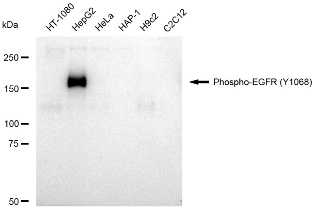 • Western blotting analysis using Phospho-EGFR (Y1068) antibody. Total cell lysates (30 μg) from various cell lines were loaded and separated by SDS-PAGE. The blot was incubated with Phospho-EGFR (Y1068) antibody and HRP-conjugated goat anti-rabbit secondary antibody respectively.