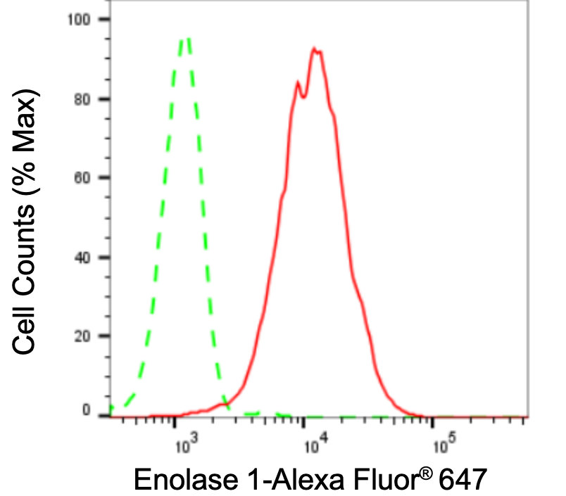 Flow cytometric analysis of Enolase 1 expression in HepG2 cells using Enolase 1 antibody. Green, isotype control; red, Enolase 1.