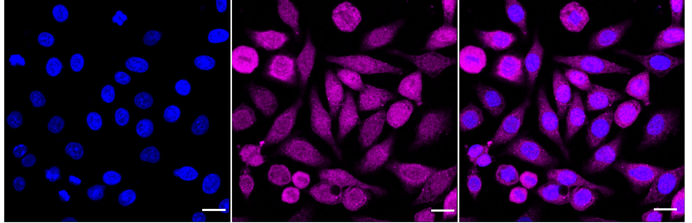 Immunocytochemical staining of HepG2 cells with Enolase 1 antibody. Nuclei were stained blue with DAPI; Enolase 1 was stained magenta with Alexa Fluor? 647. Images were taken using Leica stellaris 5. Protein abundance based on laser Intensity and smart gain: Medium. Scale bar: 20 μm.