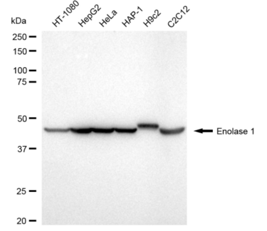 Western blotting analysis using Enolase 1 antibody. Total cell lysates (30 μg) from various cell lines were loaded and separated by SDS-PAGE. The blot was incubated with Enolase 1 antibody and HRP-conjugated goat anti-rabbit secondary antibody respectively.