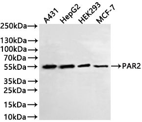 Positive WB detected in: A431 whole cell lysate(30μg), HepG2 whole cell lysate(30μg), HEK293 whole cell lysate(30μg), MCF-7 whole cell lysate(30μg)