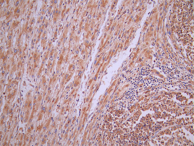 • IHC image of CSB-RA970878A0HU diluted at 1:100 and staining in paraffin-embedded human liver cancer performed on a Leica BondTM system. After dewaxing and hydration, antigen retrieval was mediated by high pressure in a citrate buffer (pH 6.0). Section was blocked with 10% normal goat serum 30min at RT. Then primary antibody (1% BSA) was incubated at 4°C overnight. The primary is detected by a Goat anti-rabbit polymer IgG labeled by HRP and visualized using 0.05% DAB.