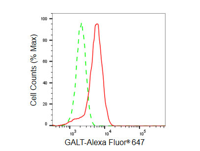 • Flow cytometric analysis of GALT expression in HeLa cells using GALT antibody. Green, isotype control; red, GALT.
