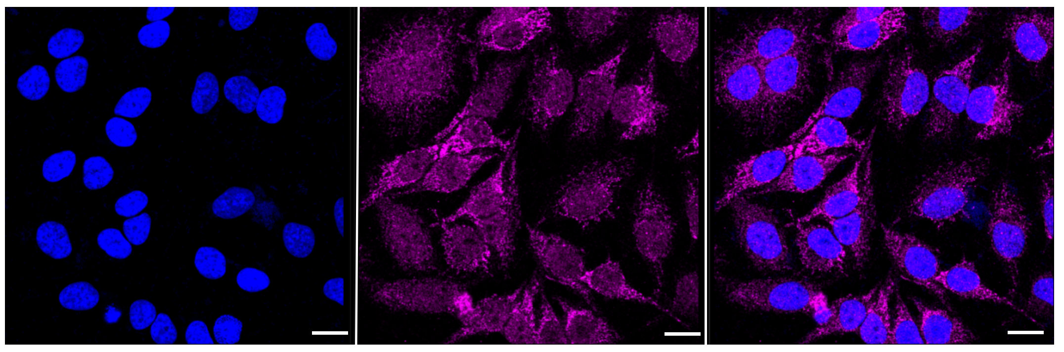 • Immunocytochemical staining of Hela cells with GALT antibody. Nuclei were stained blue with DAPI; GALT was stained magenta with Alexa Fluor? 647. Images were taken using Leica stellaris 5. Protein abundance based on laser Intensity and smart gain: Medium. Scale bar: 20 μm.