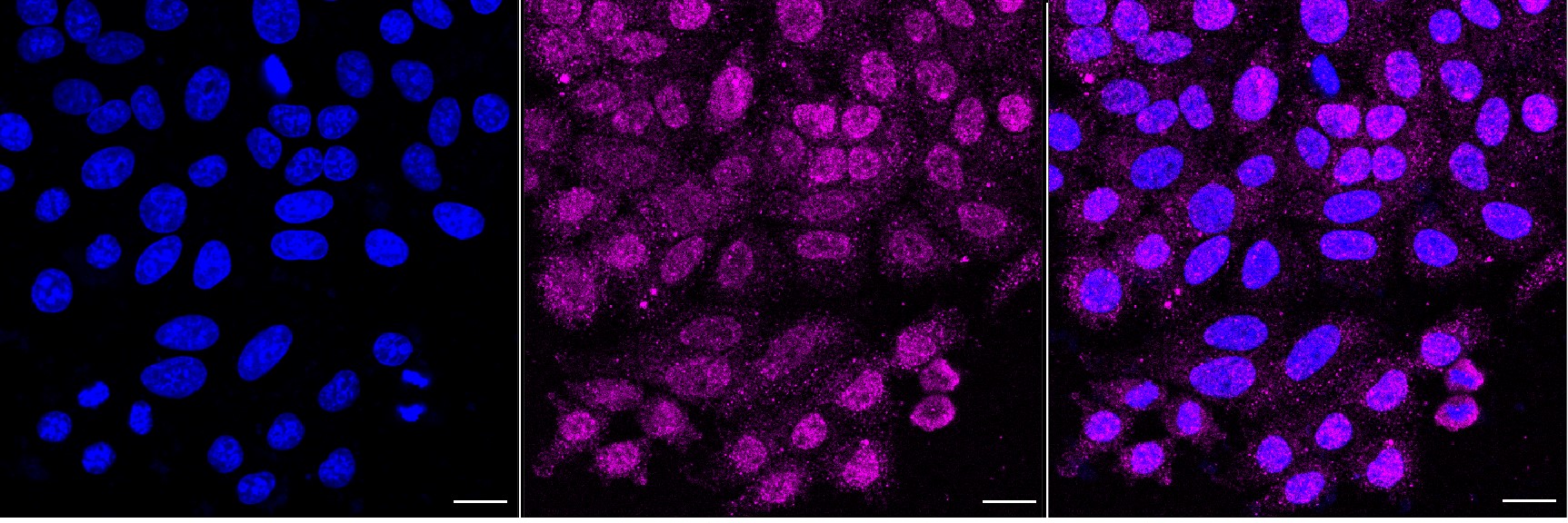 • Immunocytochemical staining of HepG2 cells with phospho-GATA3 (S308) antibody. Nuclei were stained blue with DAPI; Phospho-GATA3 (S308) was stained magenta with Alexa Fluor? 647. Images were taken using Leica stellaris 5. Protein abundance based on laser Intensity and smart gain: Medium. Scale bar, 20 μm.