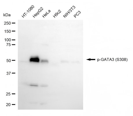 • Western blotting analysis using phospho-GATA3 (S308) antibody. Total cell lysates (30 μg) from various cell lines were loaded and separated by SDS-PAGE. The blot was incubated with phospho-GATA3 (S308) antibody and HRP-conjugated goat anti-rabbit secondary antibody respectively.