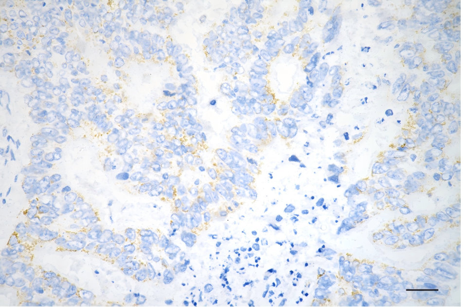 Immunohistochemistry was performed on paraffin-embedded human sigmoid colon carcinoma using glutaminase antibody. Antigen retrieval was done in sodium citrate buffer (pH 6.0). DAB was used for detection, with hematoxylin counterstaining. Images were acquired using a Nikon Ci-L Plus microscope (40× objective). Scale bar: 25 μm.