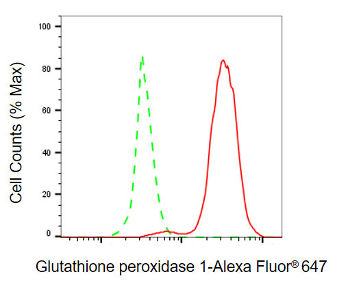 Flow cytometric analysis of glutathione peroxidase 1 expression in Hela cells using glutathione peroxidase 1 antibody. Green, isotype control; red, glutathione peroxidase 1.