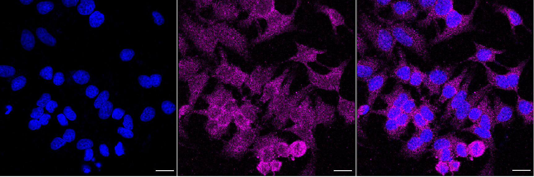 Immunocytochemical staining of Hela cells with glutathione peroxidase 1 antibody. Nuclei were stained blue with DAPI; Glutathione peroxidase 1 was stained magenta with Alexa Fluor? 647. Images were taken using Leica stellaris 5. Protein abundance based on laser Intensity and smart gain: Low. Scale bar, 20 μm.