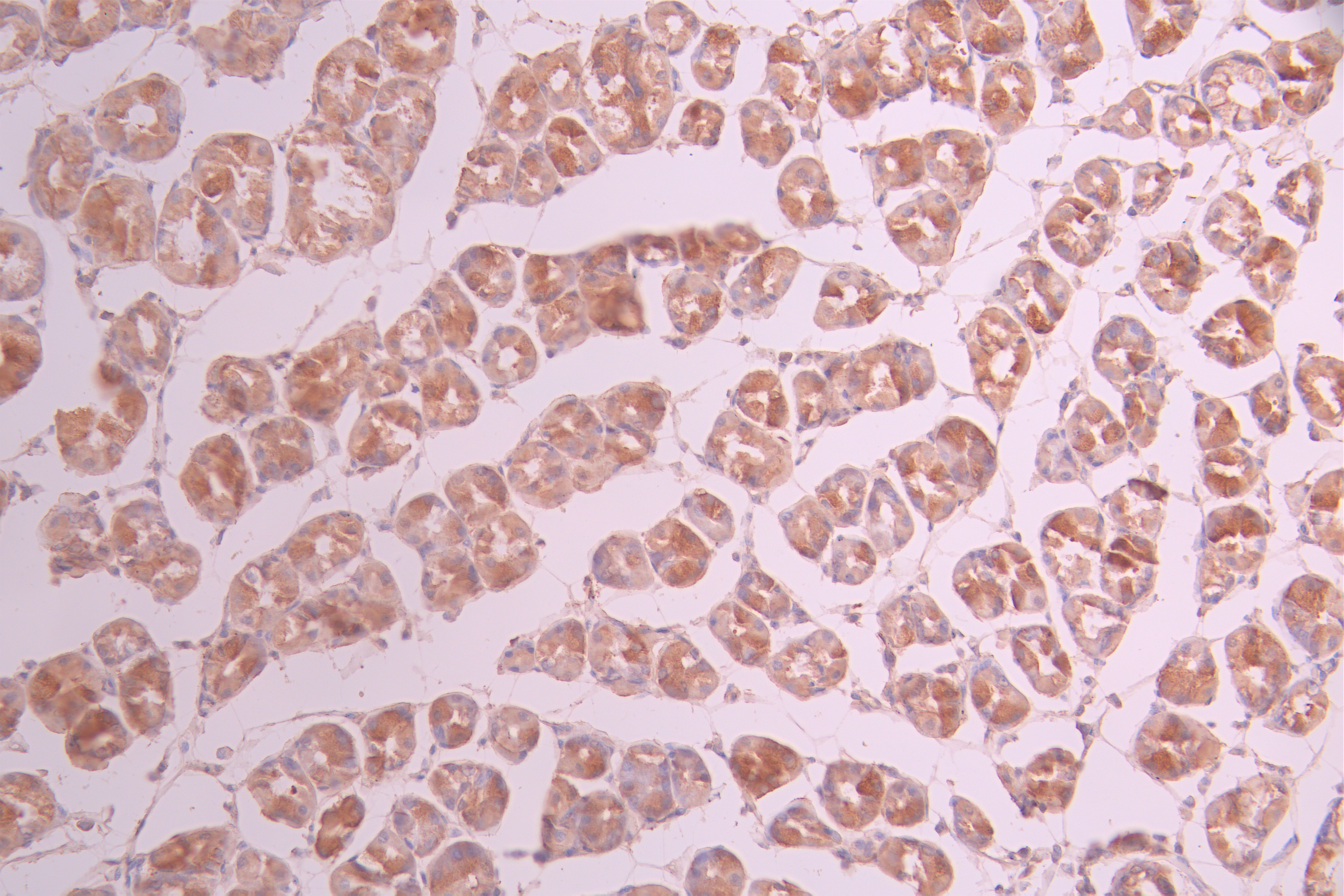 IHC image of CSB-RA158046A0HU diluted at 1:100 and staining in paraffin-embedded human stomach tissue performed on a Leica BondTM system. After dewaxing and hydration, antigen retrieval was mediated by high pressure in a citrate buffer (pH 6.0). Section was blocked with 10% normal goat serum 30min at RT. Then primary antibody (1% BSA) was incubated at 4°C overnight. The primary is detected by a Goat anti-rabbit polymer IgG labeled by HRP and visualized using 0.05% DAB.