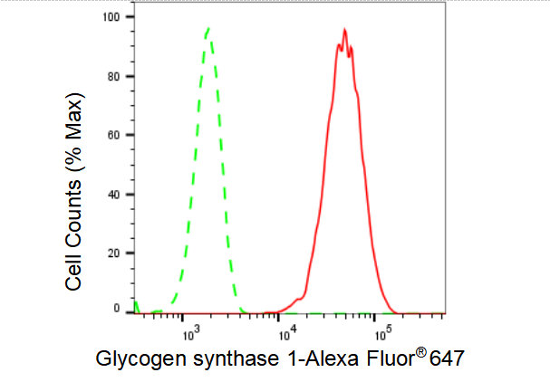 Flow cytometric analysis of Glycogen synthase 1 expression in HepG2 cells using Glycogen synthase 1 antibody. Green, isotype control; red, Glycogen synthase 1.